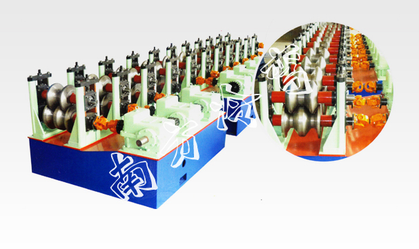 由放卷機、沖孔切斷機、快速送料、成型主機、校正裝置、收料臺、主傳動部分、電器操作柜組成的冷彎機組專用生產線。 本機組生產適應:高速公路護欄。 另型號機組可把公路上撞壞、變形、扭曲后的護欄板進行修復,整形后仍可使用。
